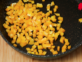 Tagliate i peperoni a pezzetti, fateli cuocere in una padella antiaderente a fuoco vivace con un filo di olio evo.