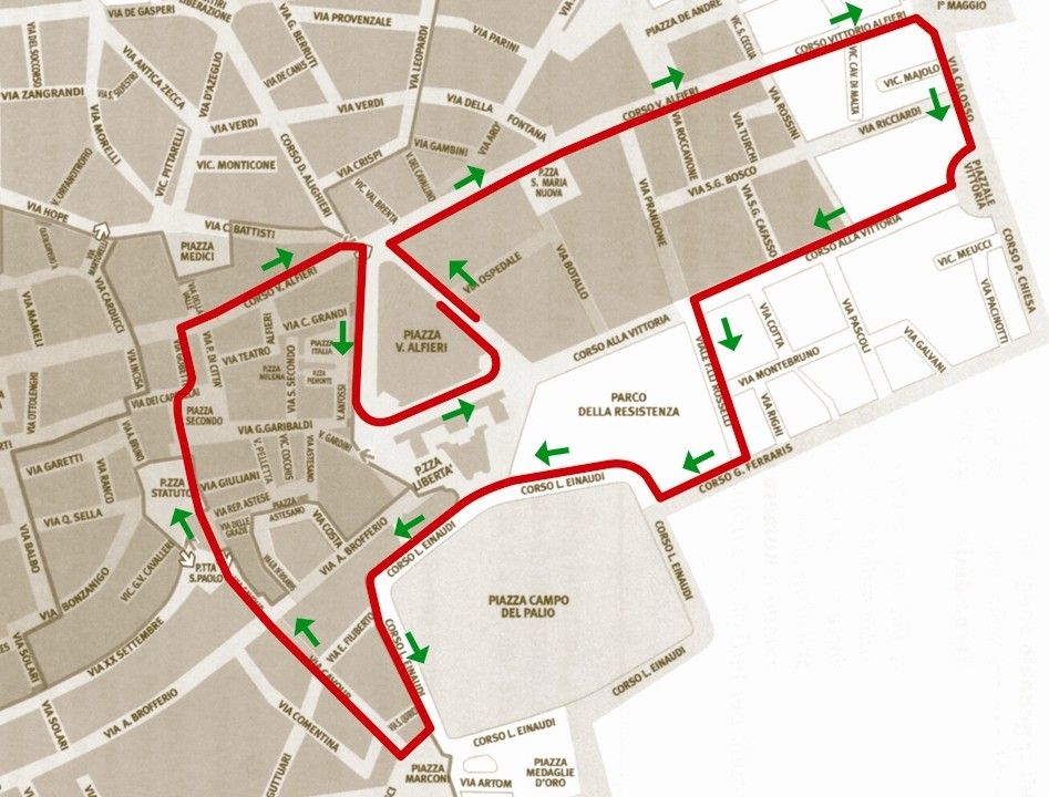 C.so Alfieri - P.za 1° Maggio, Via Calosso, P.le della Vittoria, C.so alla Vittoria, Via F.lli Rosselli, C.so Einaudi, P.za Marconi, Via Cavour, P.za Statuto, P.za S.Secondo, Via Gobetti, C.so Alfieri - P.za Alfieri (arrivo).