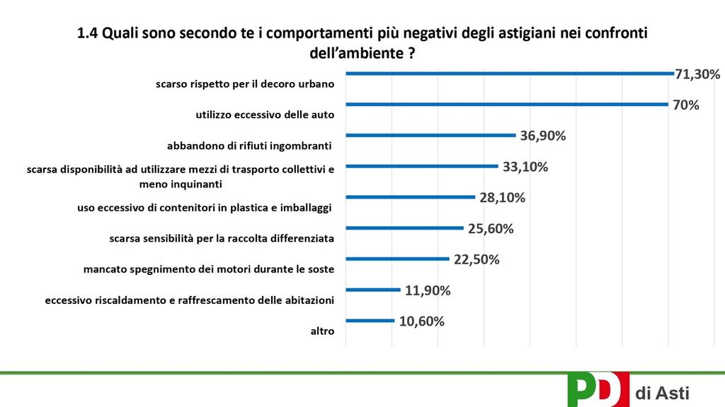 Il 62% pensa che gli astigiani siano poco rispettosi nei confronti dell’ambiente e il 71,30 ritiene che il comportamento più negativo degli astigiani nei confronti dell’ambiente, sia lo scarso rispetto per il decoro urbano.