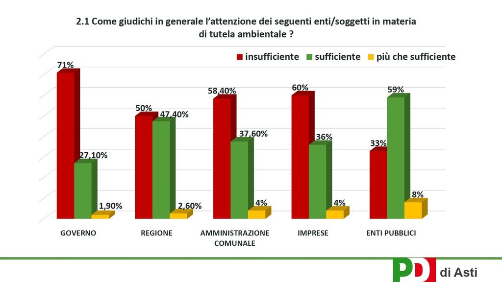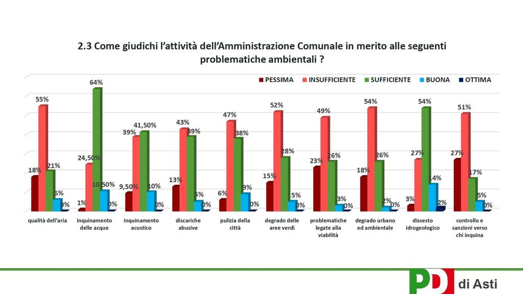 Il 41, 8 per cento pensa che la qualità dell’ambiente ad Asti sia insufficiente, il 36,10 per cento la ritiene sufficiente, il 12 pessima, buona un ottimista 10 per cento.