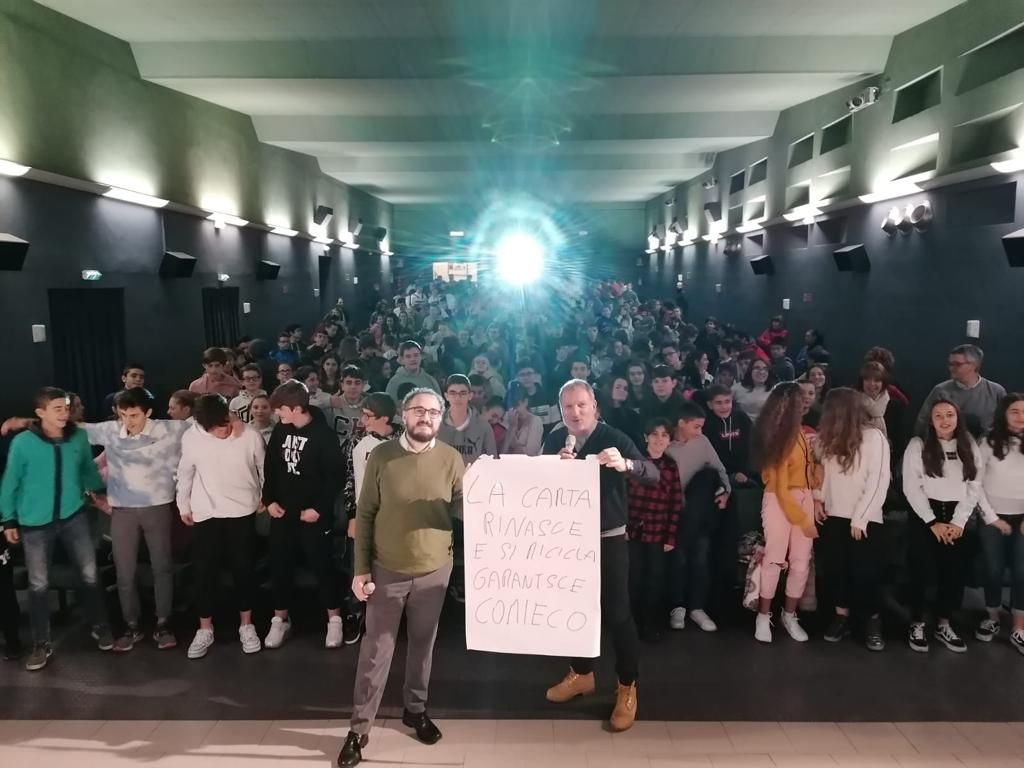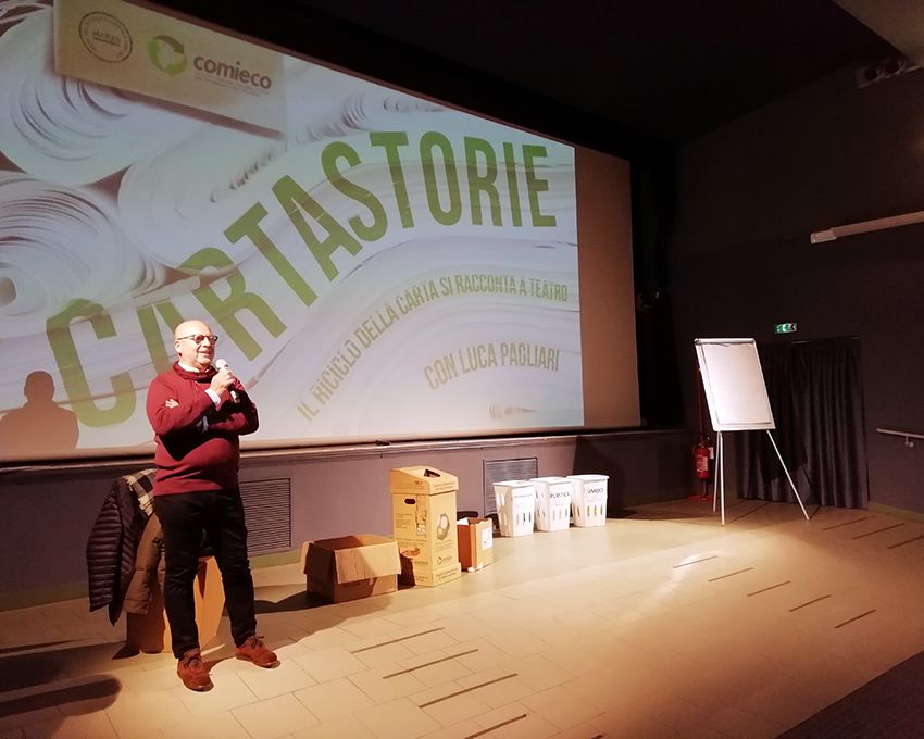 Salone del Cinema Lumière gremito di studenti mercoledì per la chiusura del tour autunnale di Cartastorie, lo spettacolo teatrale di Comieco - Consorzio Nazionale per il Recupero e Riciclo degli imballaggi a base cellulosica.