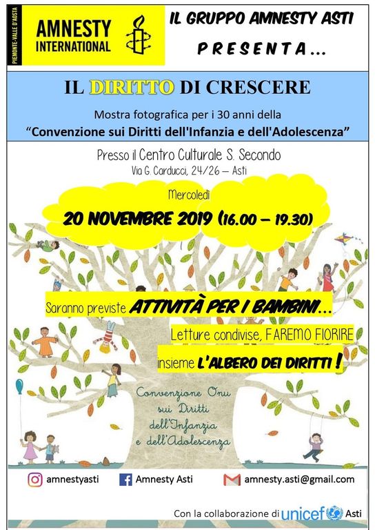 In occasione del trentennale della “Convenzione Internazionale sui diritti dell’infanzia e dell’adolescenza”, approvata dall’Assemblea Generale delle Nazioni Unite il 20 novembre 1989, il gruppo astigiano di Amnesty International organizza per la “Giornata Mondiale dei diritti dell’infanzia” la mostra: