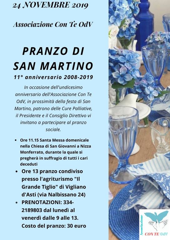 Per festeggiare l’undicesimo anniversario dell’associazione “Con Te OdV”, che ha sede in corso Savona 237, domenica 24 novembre si svolgerà un importante momento di festa che coinciderà con le celebrazioni di San Martino, patrono delle Cure Palliative.