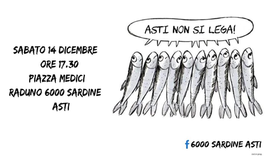 Nato dall'impeto dell'onda bolognese, il gruppo “6000 Sardine” di Asti scende in piazza per il suo primo flash mob, spostandosi dalle piazze virtuali del web a quelle reali della città di Alfieri. L'appuntamento a sabato 14 dicembre alle 17.30 in piazza Medici è già stato lanciato sulla pagina Facebook alla quale hanno aderito fino ad oggi oltre 1.800 persone.