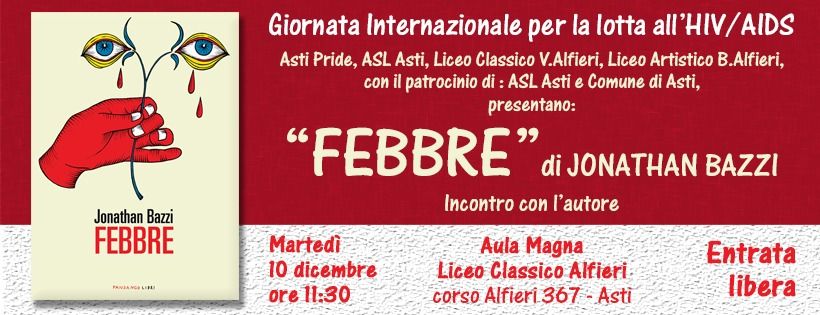 In occasione della Giornata Mondiale per la lotta e prevenzione HIV/Aids, oggi, martedì 10 dicembre alle 11.30 presso l' Aula Magna del Liceo Classico di Asti si terrà un incontro con lo scrittore Jonathan Bazzi, autore del libro "Febbre".
