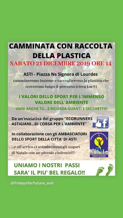 Non mancheranno i giovani del Friday For Future di Asti , che stanno preparandosi anche ad altre iniziative come la "Camminata con raccolta della plastica" in programma ad Asti il 21 dicembre, insieme agli Ambasciatori dello Sport, per ribadire, armati di sacchi e ramazze il valore dell'ambiente e dello sport. Ci saranno anche rappresentanti di "Asti Cambia", formato da cittadini e associazioni. L'appuntamento sarà da piazza Ns. Signora di Lourdes per una camminata di 8 km "contro la plastica". L'iniziativa è di Ecorunners astigiani... di corsa per l'ambiente