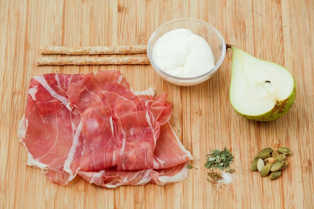 Un SUPER SECONDO PIATTO, perfetto per un pasto leggero ma gustoso. Il prosciutto crudo ha molte proteine di ottima qualità, ferro e la giusta sapidità che non rende necessaria l’aggiunta di sale. Una minima quantità di carboidrati arriva dai grissini integrali, ricchi di fibre. Lo stracchino di regala una nota cremosa, oltre a calcio e vitamina D. La pera ci avvantaggia con la sua ricchezza di fibre e potassio mentre i semi di zucca risultano energizzanti di giorno e rilassanti di sera.