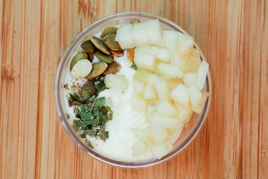 Mescolate i cubetti di pera con lo stracchino, i semi di zucca, l’erba cipollina, sale (solo se necessario) e pepe fino ad ottenere un composto omogeneo