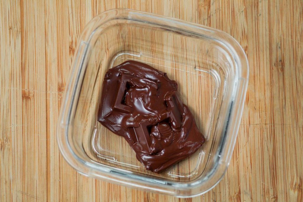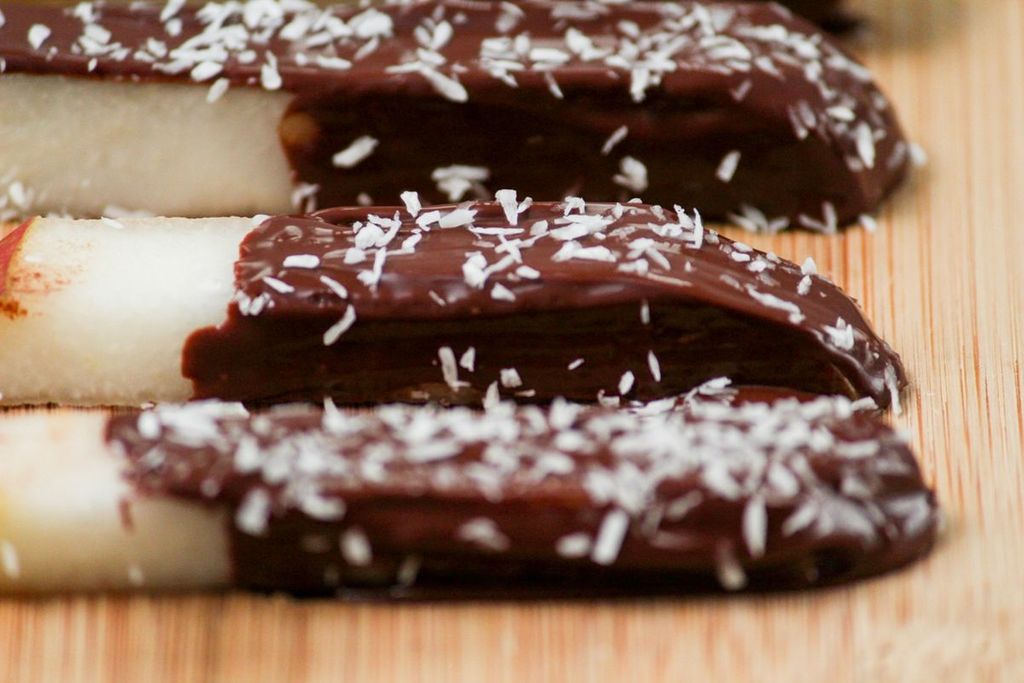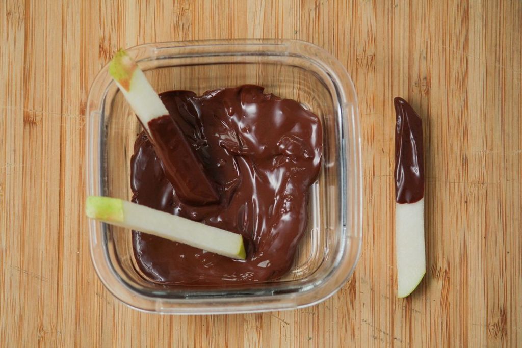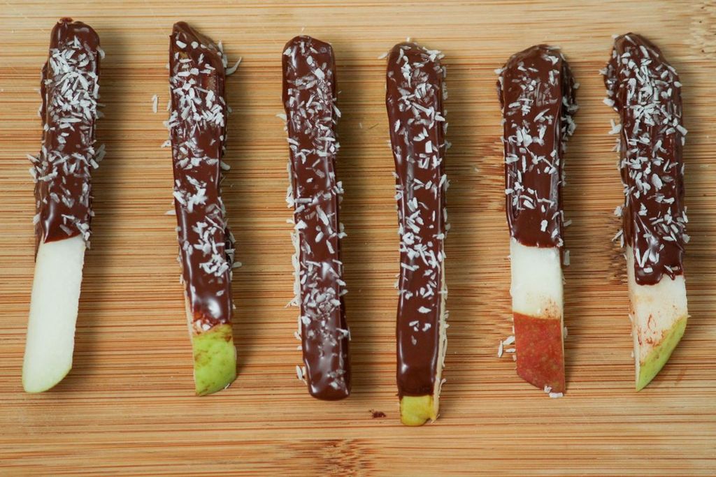 Ricoprite i bastoncini di pera con il cioccolato fuso.
