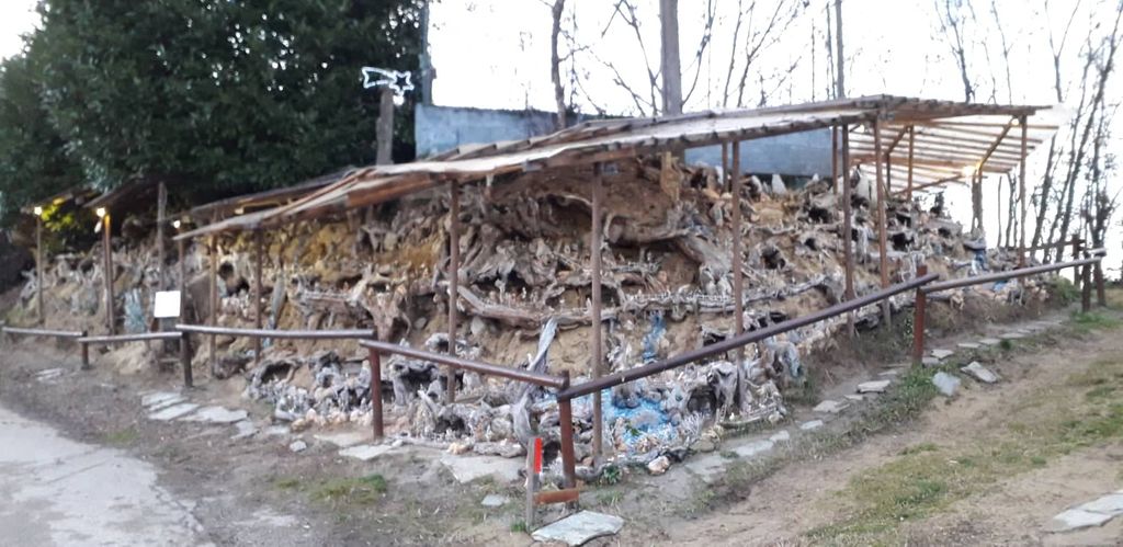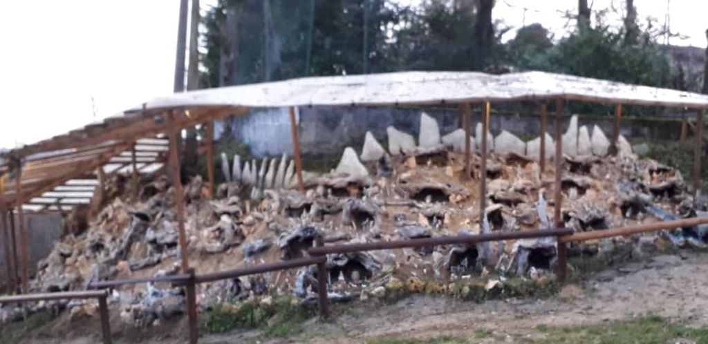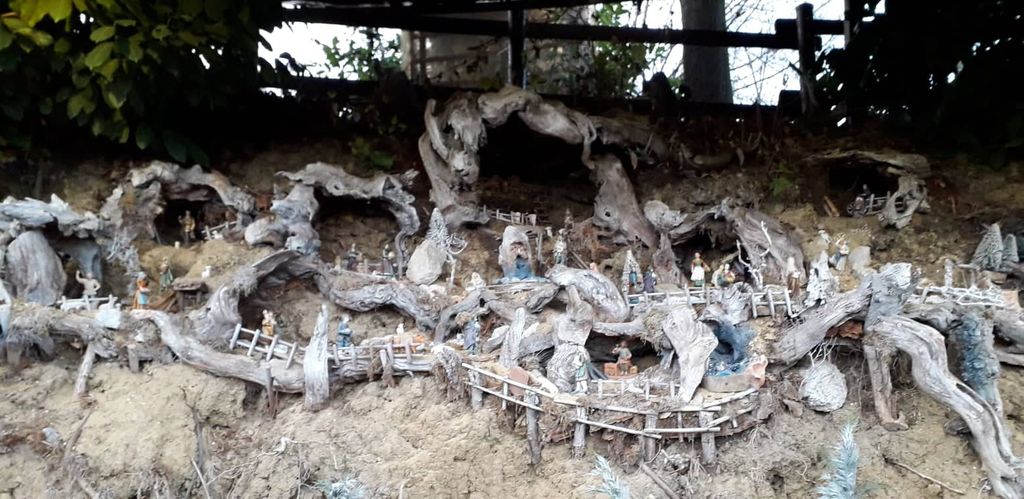 Più di 300 le statue figurative. Il presepe è stato costruito in tronchi d'albero tra le radici di una riva, sulla strada che porta alla piccola frazione, le nicchie sono scavate nel tufo.