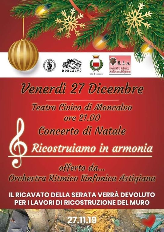 L' Orsa, Orchestra Ritmico Sinfonica Astigiana, questa sera alle 21 suonerà al Teatro civico di Moncalvo per aiutare i lavori di ricostruzione del muro crollato a novembre in corso XXV aprile.