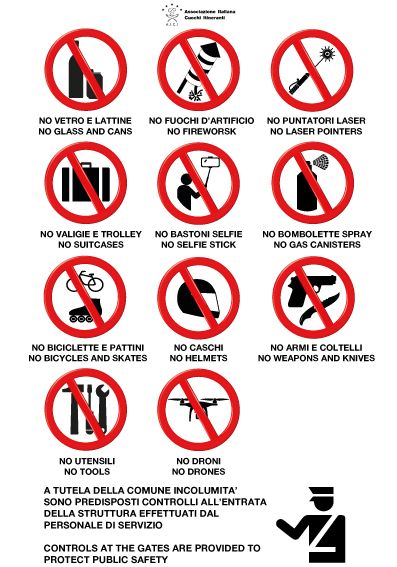 Non si potranno portare bevande in vetro e lattine. All'interno della piazza è vietata l’introduzione di oggetti o strumenti atti ad offendere e puntatori laser.