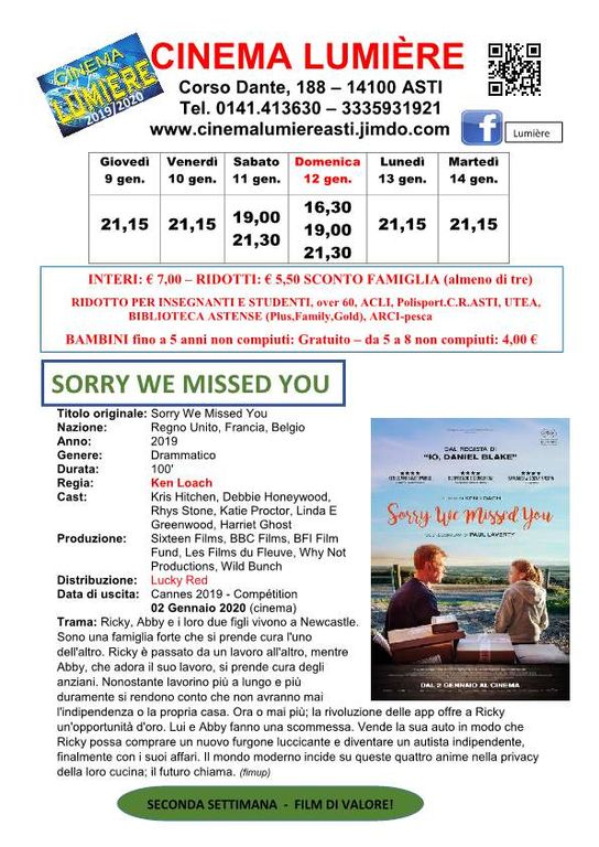 Domenica 12 gennaio - ore 16,30 - 19,00 e 21,30: Sorry we missed you