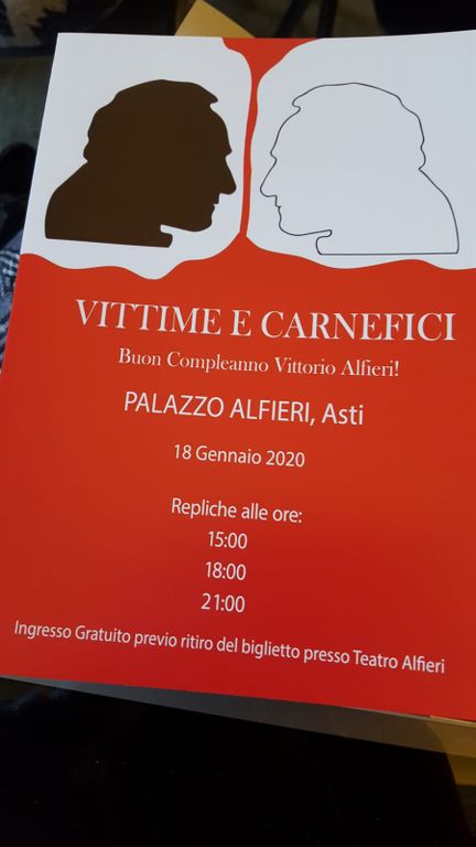 Il 18 gennaio a Palazzo Alfieri tre appuntamenti teatrali (alle ore 15, alle ore 18 e alle ore 21) che animano il palazzo con giovani attori professionisti per un viaggio teatrale nella casa del poeta. Si intitola 'Vittime e carnefici' è la regia è curata da Marco Viecca. "Vittime e carnefici non nella violenza fisica e verbale, ma a livello psicologico. Da questo punto di vista Alfieri fu precursore" ha affermato Viecca.