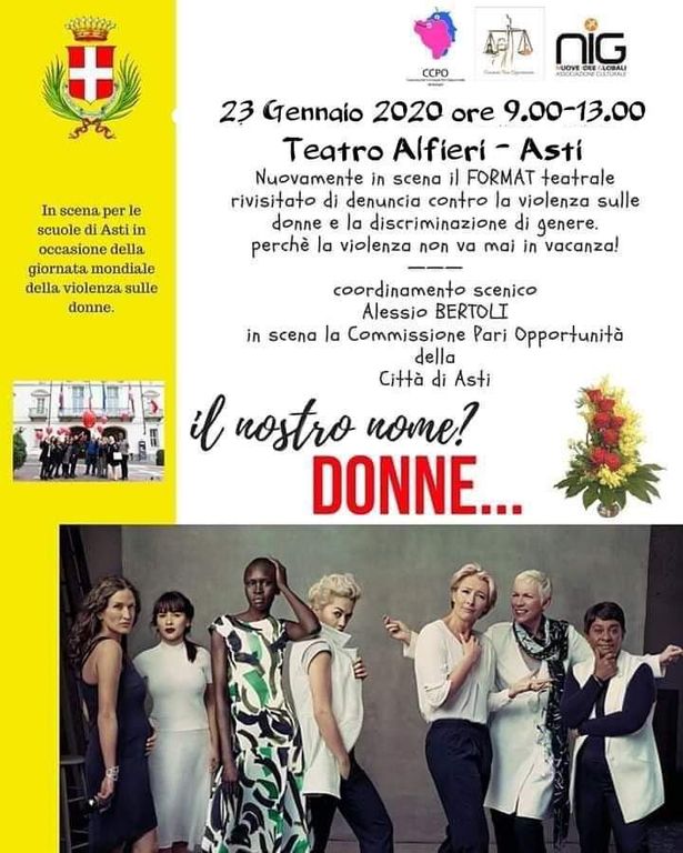 Giovedì 23 gennaio p.v., nella prestigiosa cornice del Teatro Alfieri, verrà portata in scena la performance teatrale “Il nostro nome… donne”, evento promosso dall’assessorato alle Pari Opportunità della Città di Asti e dalla Commissione Comunale Pari Opportunità, dedicato alle scuole secondarie di secondo grado della città.