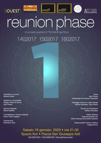 Il 18 Gennaio 2020 ad Asti si assisterà al formato numero 1 di Reunion Phase, dal titolo “1402017 1502017 1602017”: un “solo” di danza che si relaziona strettamente con musica, teatro, video e paesaggi luminosi. La prima produzione dello Spazioovest di Vignale Monferrato, il nuovo centro delle arti dal vivo. “Il tema è ‘l’Estinzione’– dice Ugo Pitozzi – a partire dal senso di ciò a cui il pubblico va a partecipare: linguaggi multipli usati per la performance che si estinguono negli occhi e nell'udito, minuto dopo minuto, così che il ricordo/reinvenzione è il motore per vedere la performance. Il gesto coreografico si arricchisce di movimenti ed energie, con varie gradazioni di presenza, per poi estinguersi in stasi e silenzi e in strette relazioni compositive tra corpo reale e corpi virtuali. Lo stesso per la musica, è un lavoro di tessitura del suono che, come accade per le stelle, nell'atto della cattura è un suono già estinto”.