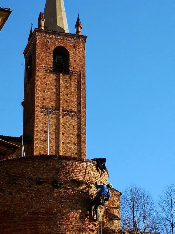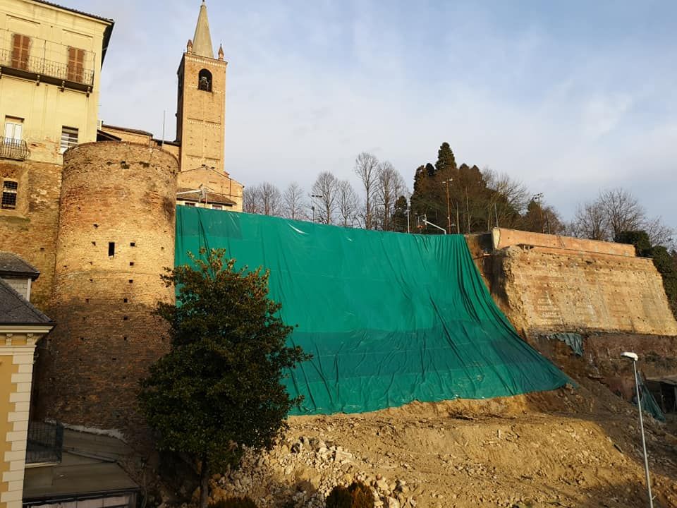 Un grande telone verde "comparso" sul muro crollato a Moncalvo. I lavori sono a buon punto [FOTO]