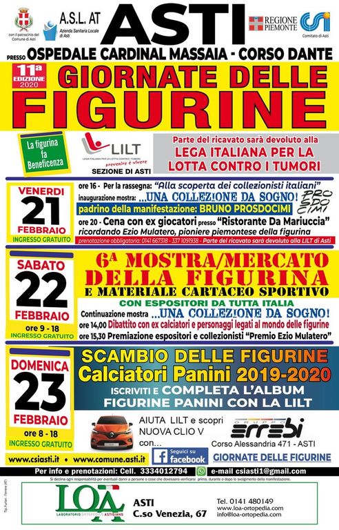 L’iniziativa, patrocinata dal Comune di Asti e promossa dal Centro Sportivo Italiano Asti in collaborazione con Andrea Morando, vede la realizzazione di tre giornate, 21, 22 e 23 febbraio, dedicate alla passione per la figurina, con espositori, mostre, cimeli e rarità.