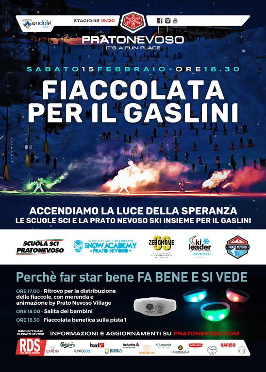 “Sarà una delle fiaccolate più grandi d’Europa per numero – spiegano gli organizzatori - ci apre il cuore sapere che aiuterà anche a raccogliere fondi per far star bene tanti piccoli pazienti oncologici. Alcuni di loro, guariti, sono stati ospitati la scorsa estate a Prato Nevoso. Una vacanza con le loro famiglie all’insegna del divertimento e della gioia ritrovata dopo la malattia”. E dopo la fiaccolata dei piccoli a Prato già pensano a un notturno dedicato sempre al Gaslini fissato per VENERDÌ 6 MARZO. L'incasso di quella serata sugli sci sarà devoluto per intero all’ospedale genovese perché “fare del bene fa star bene”.
