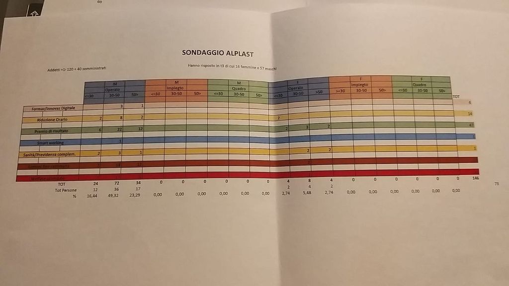 Alla Alplast di Tigliole, con 146 dipendenti, di cui 73 che hanno partecipato al questionario, si richiedono più premi di risultato e bonus weekend.