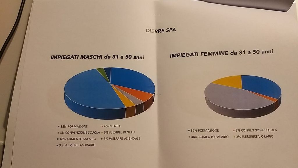 Alla Dierre di Villanova d'Asti, con 326 addetti di cui 216 che hanno aderito al questionario, si richiede maggiormente un aumento di salario e ulteriori corsi di formazione.