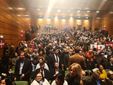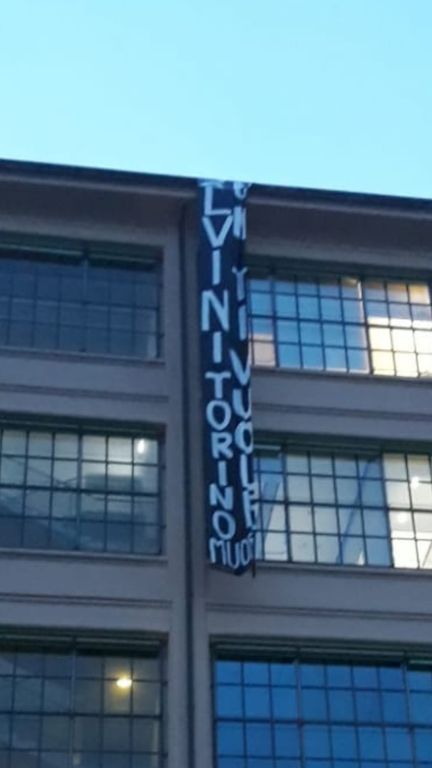 La sala dei 500 era già piena alle 17.30, un'ora prima dell'arrivo del leader del Carroccio, e diverse centinaia di persone sono rimaste fuori dai cancelli. Sopra l'ingresso della sala ignoti hanno srotolato uno striscione, con la scritta, "Salvini, Torino non ti vuole. Muori!".
