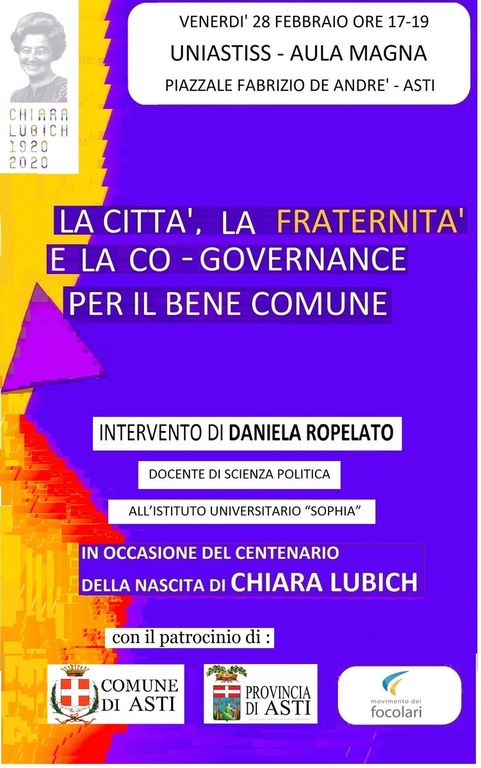 Momento centrale dell’evento sarà l’intervento della professoressa Daniela Ropelato docente stabile straordinario di Scienza Politica presso l’Istituto Universitario Sophia nonché Vice Preside dell’Istituto stesso, Coordinatrice del Dipartimento di Scienze Sociali e Politiche, intitolato LA CITTA’, LA FRATERNTA’ E LA COGOVERNANCE PER IL BENE COMUNE.