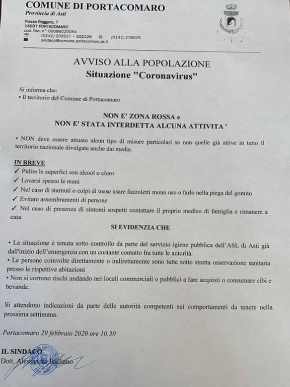 Un avviso scritto e affisso in Municipio ieri spiegava che "Non è stata istituita nessuna zona rossa e nessuna attività è stata interdetta", e dopo alcuni consigli pratici di igiene, il sindaco Alessandro Balliano ha specificato:"La situazione è sotto controllo da parte del Servizi Igiene Pubblica della Asl di Asti e le persone coinvolte direttamente o indirettamente, sono sotto stretta osservazione nelle abitazioni".