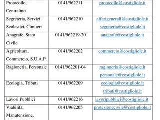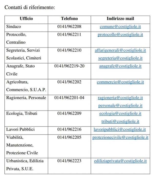 A Costigliole d'Asti gli uffici comunali ricevono solo su appuntamento