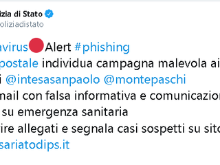 A dimostrazione che le campagne di Spam/Phishing stanno continuando, il profilo Twitter della Polizia di Stato riporta dal giorno 28 febbraio notizie sulle minacce nuove.
