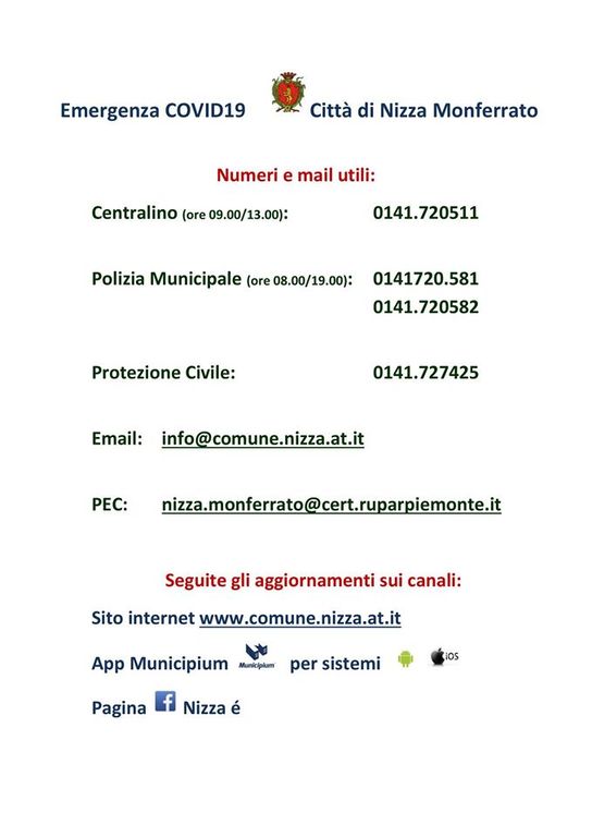 In un messaggio su facebook e instagram il sindaco Simone Nosenzo ha raccomandato ai suoi cittadini di tenersi sempre informati tramite i canali ufficiali (Comune, app Municipium, Prefettura di Asti) per essere sempre aggiornati.