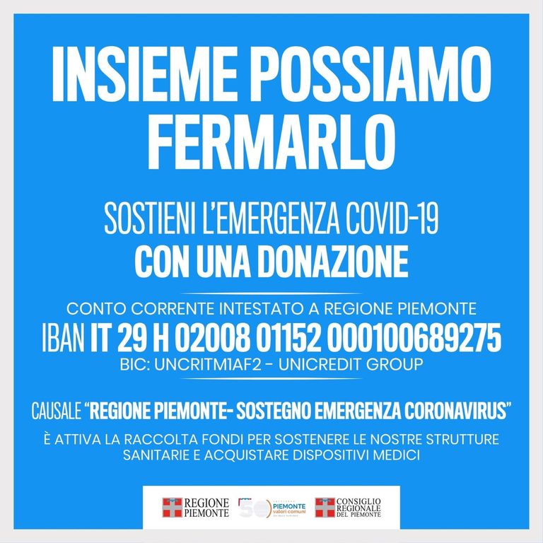 Il progetto prevede donazioni su un conto corrente dedicato i cui proventi serviranno interamente a sostenere le strutture sanitarie piemontesi e l’acquisto di dispositivi medici a favore dei malati di Covid-19.