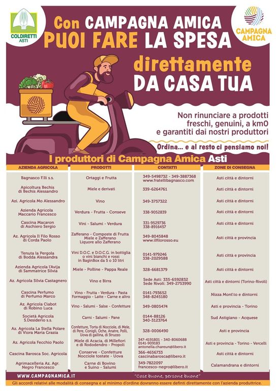 Questo l'elenco completo dei produttori agricoli Coldiretti Asti Campagna Amica che offrono già il servizio di consegna a domicilio della spesa. L’elenco sarà via via aggiornato sul sito web https://asti.coldiretti.it.
