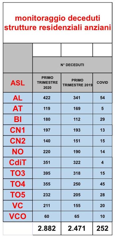 Ieri c'è stata una conferenza stampa in Regione su questo tema: In Piemonte i morti legati alle RSA, alla data del 31 marzo, sono 411 in più rispetto al primo trimestre del 2019.