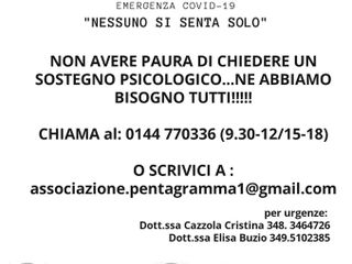 Anche la Città di Canelli ha recentemente patrocinato il progetto “Nessuno si senta solo”. Un servizio di sostegno psicologico completamente gratuito, fornito dall’associazione “Pentagramma”, che mette gratuitamente a disposizione dei cittadini l’aiuto concreto e continuativo di professionisti che possono contribuire ad alleviare il disagio psicologico generato dalle norme di contenimento del coronavirus e dalle dirette conseguenze sul piano economico.