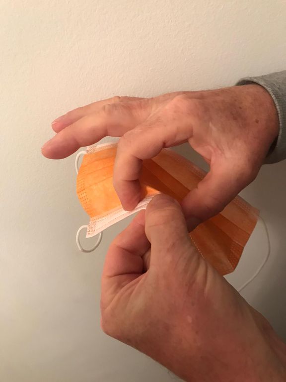 - Indossare la mascherina e verificare che il ferretto, così piegato, segua la forma del nostro naso ed aderisca alla parte del nostro viso su cui si appoggia
