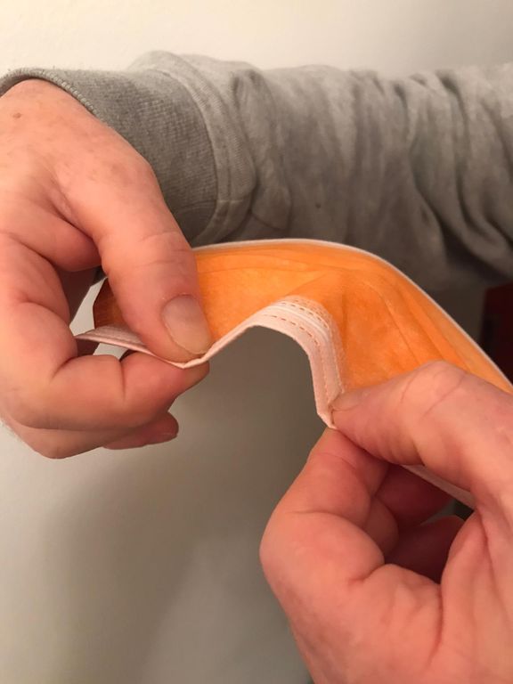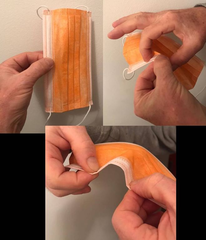 Per prima cosa occorre adattare al viso il bordo superiore. Quasi tutte le mascherine sono dotate, nella parte che va appoggiata sul naso, di un “ferretto” che può essere piegato dandogli una forma. Molti lo lasciano dritto (facendo un “effetto tenda” che lascia ampi corridoi a lato del naso). Coloro che provano a piegarlo lo fanno a mascherina indossata schiacciando ai lati del naso; questo comporta il formarsi di una piega “stretta” al centro che risulta altrettanto inadeguata. Il metodo giusto invece è il seguente: