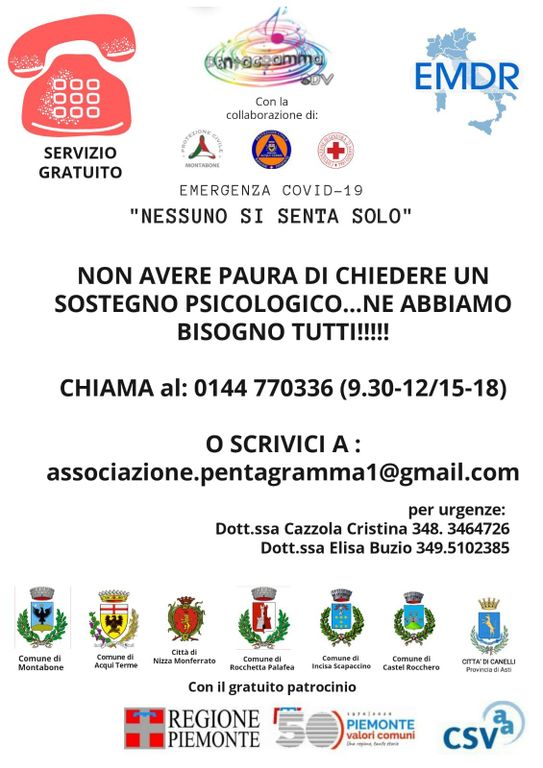 Continua anche l'iniziativa "Nessuno si senta solo" curato dall'Associazione Pentagramma 0144 770336 dalle 9.30 alle 12 e dalle 15 alle 18, associazione.pentagramma1@gmail.com