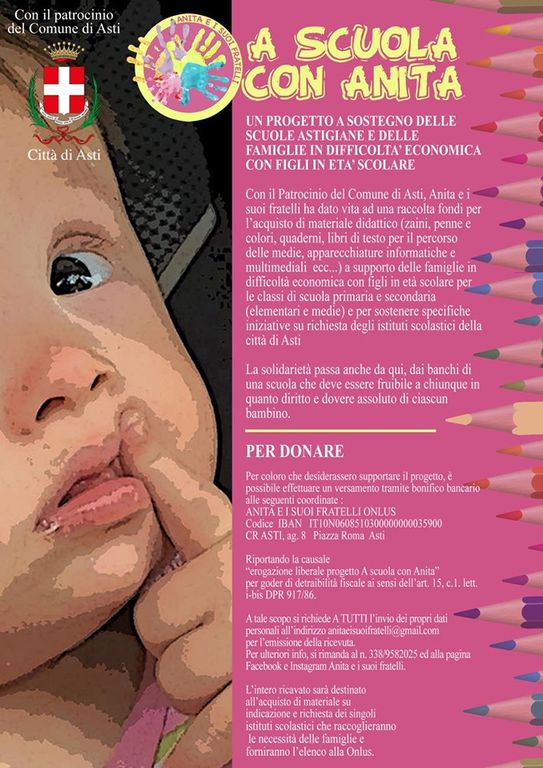 A scriverlo è l'associazione “Anita e i suoi fratelli”, che, in linea con i suoi obiettivi, da sempre rivolti al mondo dell’infanzia e dell’adolescenza, con il Patrocinio del Comune di Asti, ha dato vita al progetto “A scuola con Anita”.