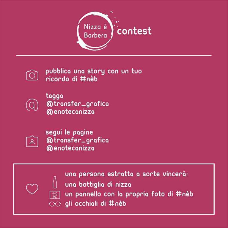 Inoltre – per iniziativa della Transfer Grafica, in collaborazione con l’Enoteca di Nizza e lo IAT di Nizza Monferrato – è nato un contest Instagram che invita a pubblicare i propri ricordi fotografici di “Nizza è Barbera” usando l’hashtag #nèb, taggando i profili @transfer_grafica e @enotecanizza e seguendo le relative pagine.