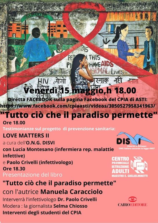 Partendo da questa domanda, e coerentemente con l’obiettivo primario di sensibilizzare sulle problematiche globali, il Centro Provinciale Istruzione per Adulti (CPIA) di Asti ha organizzato l’evento “Tutto ciò che il paradiso permette”, focalizzato sulla prevenzione dell'AIDS. Naturalmente, nell’impossibilità di utilizzare il proprio spazio fisico per ospitarlo, l’Istituto ha messo a punto una diretta Facebook, in programma venerdì 15 maggio dalle 18, che potrà essere seguita dalla pagina Facebook del CPIA, da quella della Biblioteca Interculturale Renato Bordone oppure utilizzando il seguente link :