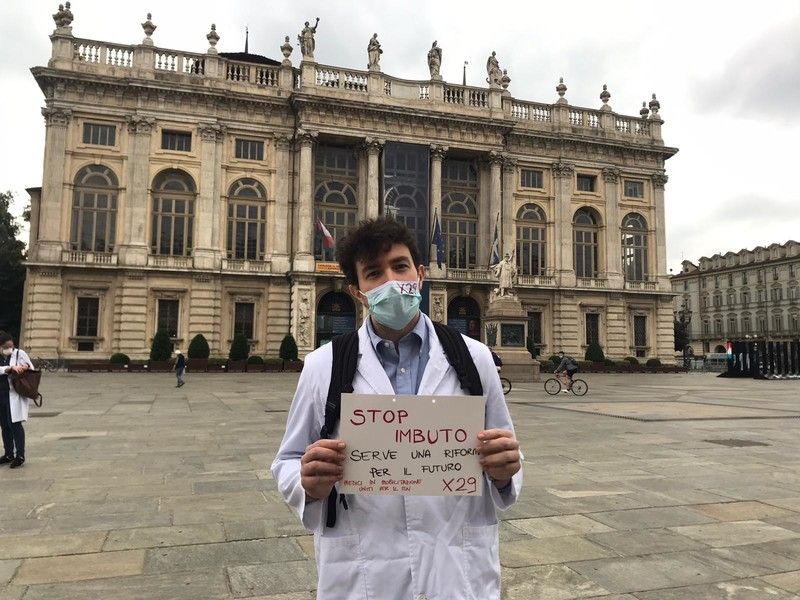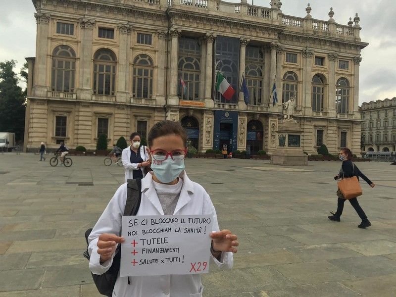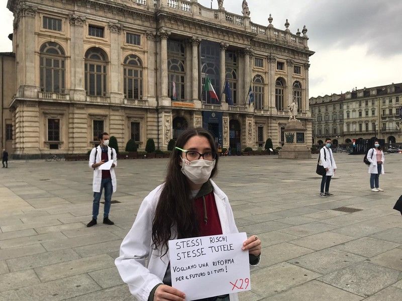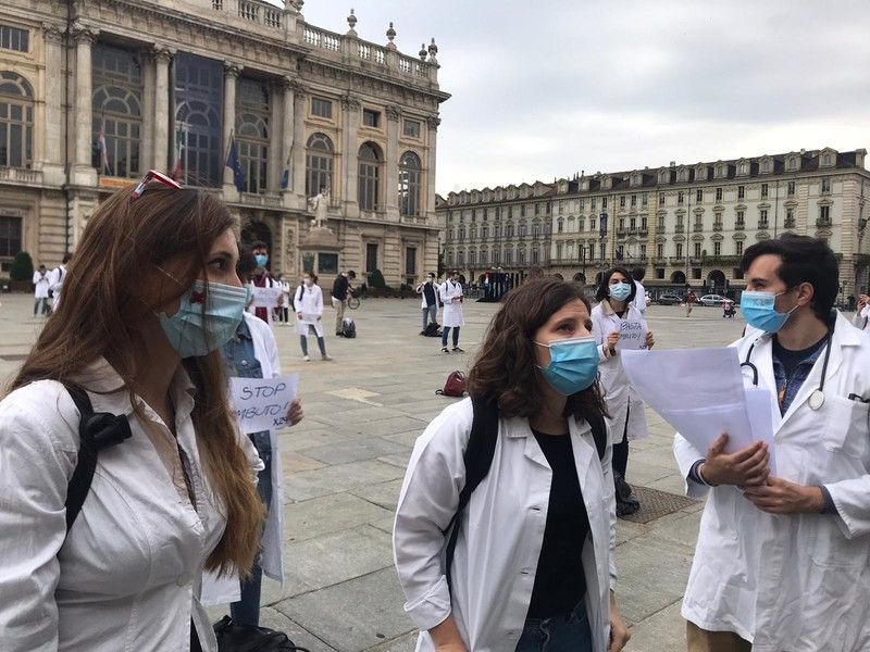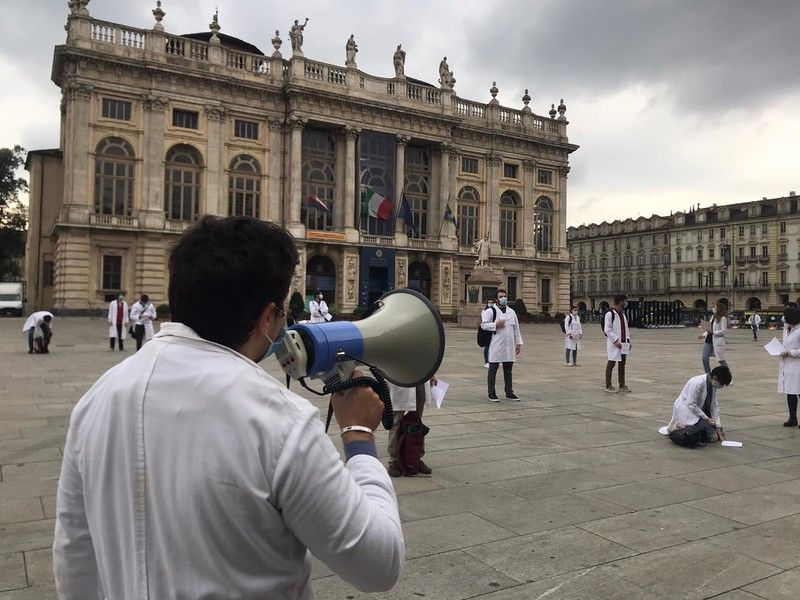 Il camice gettato a terra come gesto di rabbia. In piazza Castello, davanti alla sede della Regione Piemonte, va in scena la protesta dei medici specializzandi. Si tratta di ragazzi giovani, appena laureati, che chiedono fondamentalmente di lavorare e di essere tutelati. Chiedono riconoscenza.