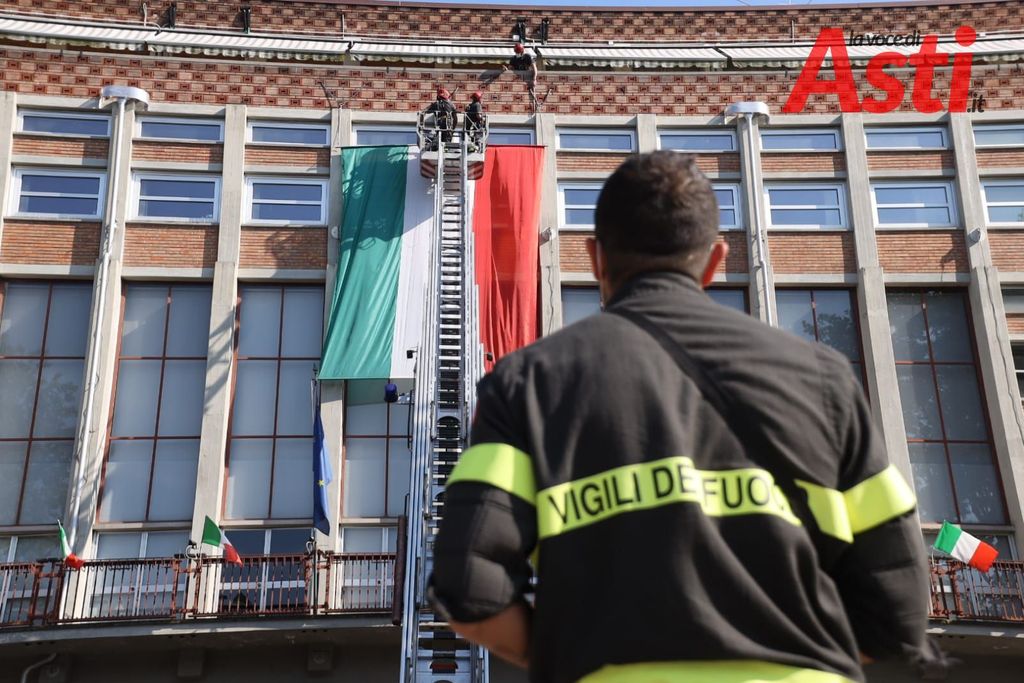 I Vigili del Fuoco di Asti nella giornata di oggi hanno provveduto all'installazione del tricolore, che si aggiunge alla luce speciale che illumina il monumento all'Unità d'Italia e agli eroi del Risorgimento eretto nel 1898 per il 50esimo anniversario dello Statuto Albertino da Leonetto Ottolenghi in piazza Roma.