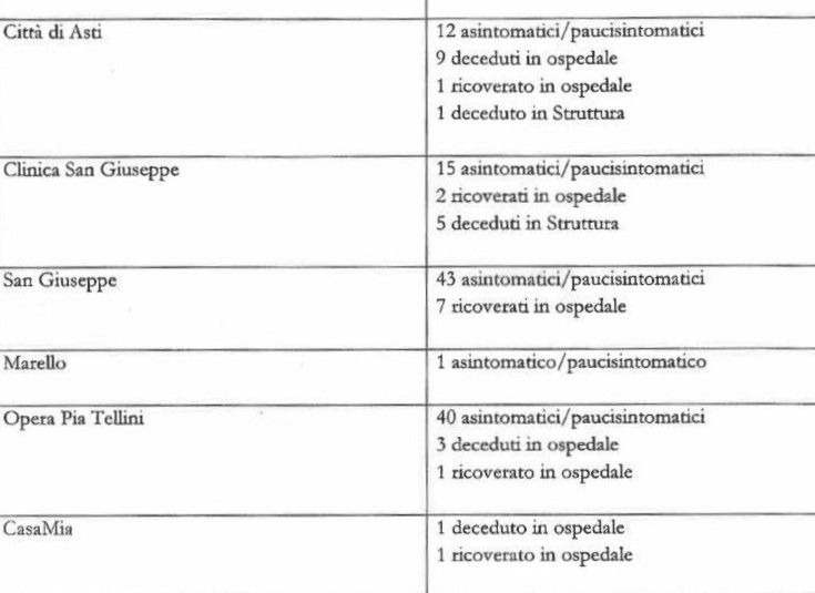 La disamina di tutti i dati forniti ci induce a profonde riflessioni sulle enormi differenze tra le diverse strutture nel numero dei contagi, tra gli ospiti e il personale e, conseguentemente, nel numero dei ricoveri e dei decessi. Le stesse profonde riflessioni sono in atto nella Asl? Quali interrogativi si sta ponendo l'Asl di Asti sulla qualità della prevenzione del contagio, sulla qualità dell’assistenza, sull’adeguatezza della presa in carico degli anziani e sulla tutela del personale nelle diverse strutture?"