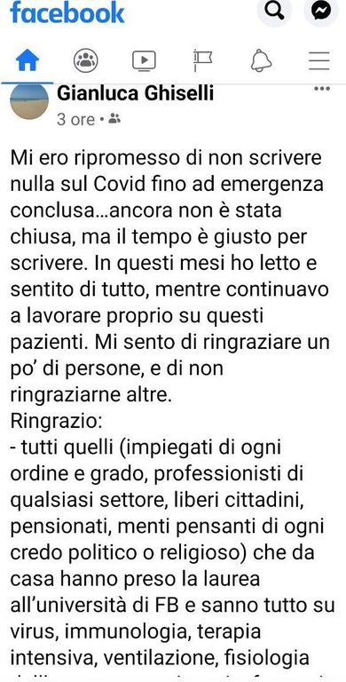 - tutti quelli (impiegati di ogni ordine e grado, professionisti di qualsiasi settore, liberi cittadini, pensionati, menti pensanti di ogni credo politico o religioso) che da casa hanno preso la laurea all’università di FB e sanno tutto su virus, immunologia, terapia intensiva, ventilazione, fisiologia dell’apparato respiratorio, farmaci anti virali ecc. Il vostro contributo è stato illuminante per la lotta a questa malattia e avete dato delle certezze granitiche;