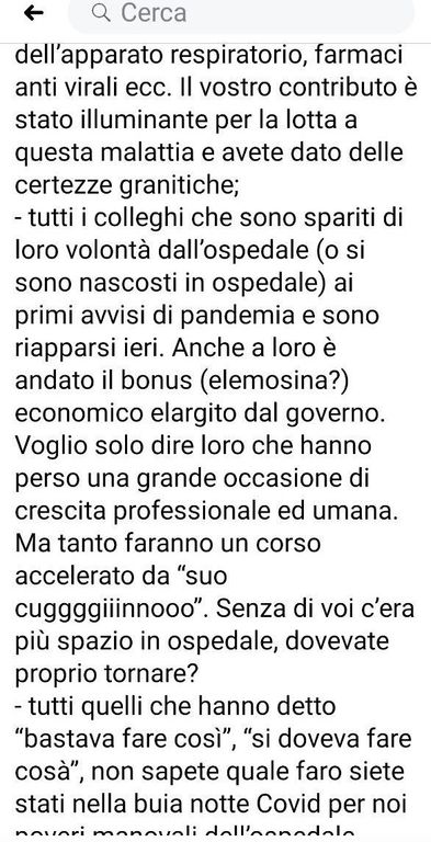 - tutti i colleghi che sono spariti di loro volontà dall’ospedale (o si sono nascosti in ospedale) ai primi avvisi di pandemia e sono riapparsi ieri. Anche a loro è andato il bonus (elemosina?) economico elargito dal governo. Voglio solo dire loro che hanno perso una grande occasione di crescita professionale ed umana. Ma tanto faranno un corso accelerato da “suo cuggggiiinnooo”. Senza di voi c’era più spazio in ospedale, dovevate proprio tornare?