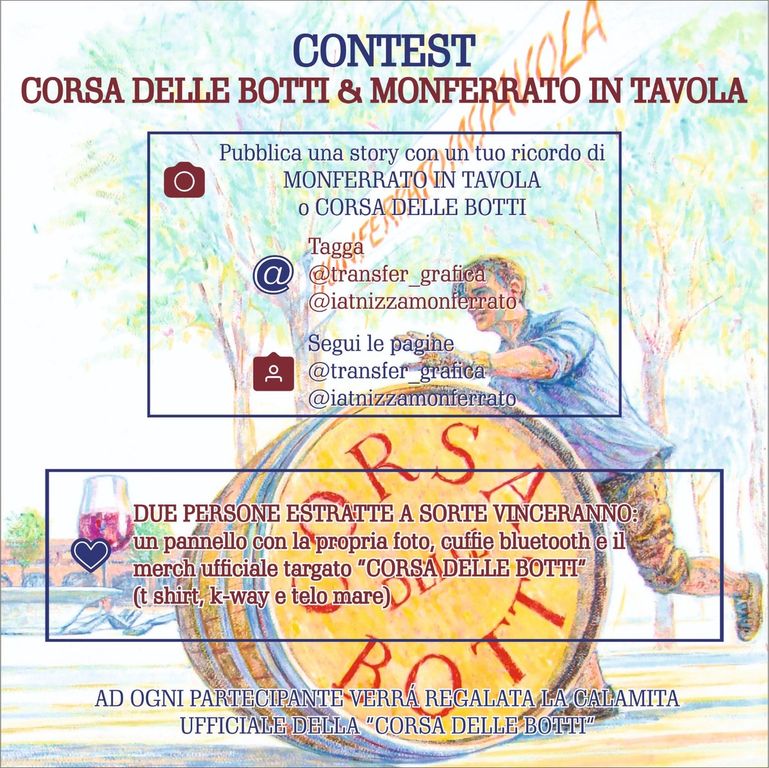 Per provare a tenere vivo il ricordo di un appuntamento classico e tanto sentito dalla gente, si è deciso di far rivivere i momenti migliori delle passate edizioni con il contest “Corsa delle Botti e Monferrato in tavola”, ideato da Fabio Terranova di Transfer Grafica assieme allo IAT di Nizza. Per il 2020 bisognerà accontentarsi dei social e dell'online, pubblicando una storia Instagram con una foto delle precedenti edizioni di Monferrato in tavola o della Corsa delle Botti.