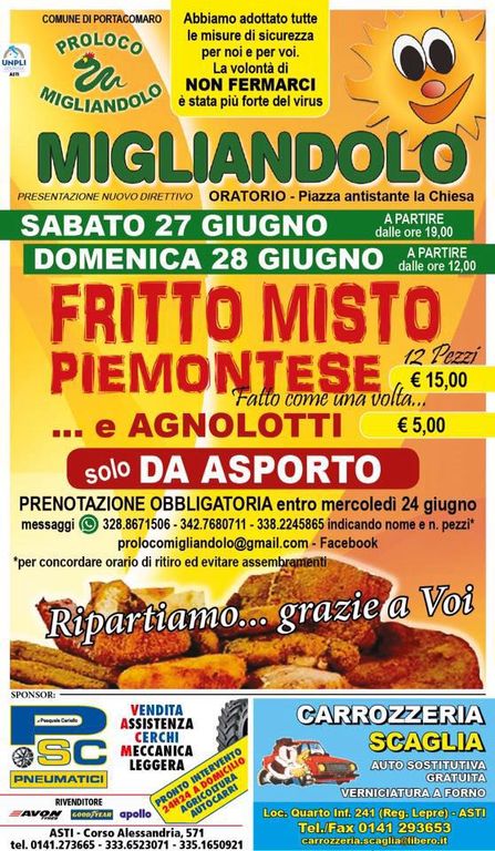 Niente Sagre? Le pro loco si organizzano per proporre qualche iniziativa durante l'estate e quella di Migliandolo, prima in Piemonte, nel prossimo week end, nei giorni della tradizionale festa, proporrà agnolotti e fritto misto take away.