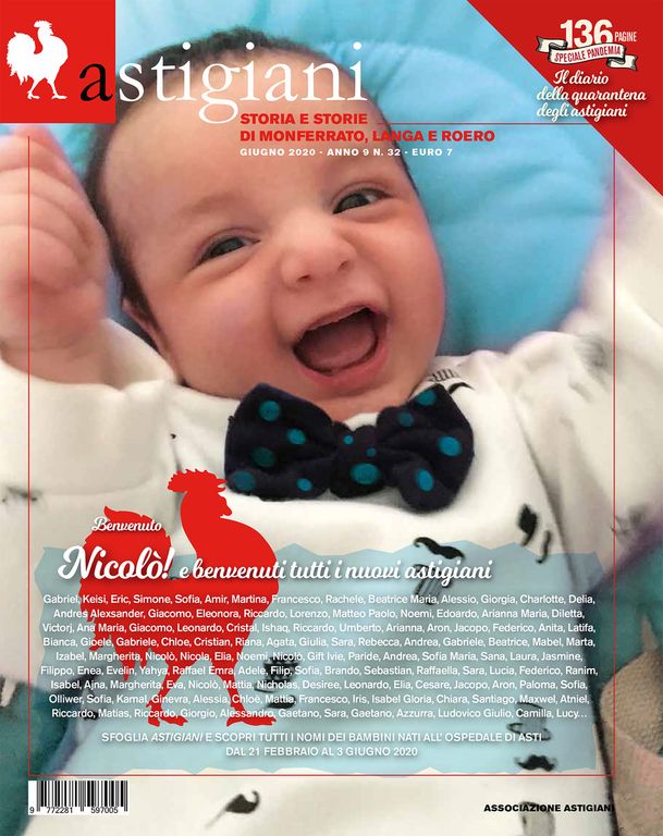 Questo numero 32 di Astigiani è speciale anche per la copertina. Sono due: la prima è dedicata a Nicolò e a tutti i bambini nati dal 21 febbraio al 3 giugno nel reparto ostetricia dell’ospedale di Asti. La rivista ne pubblica tutti i 342 nomi. Sono un inno alla vita, la risposta alla grande paura. La seconda copertina è altrettanto simbolica: il busto di Vittorio Alfieri con la mascherina, fotografato da Giulio Morra, che ha curato una sorta di film fotografico della quarantena astigiana.