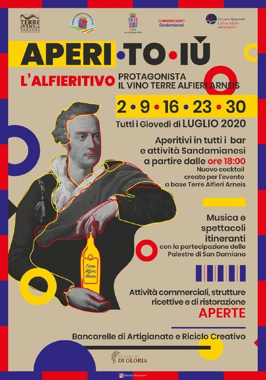 Tutti i giovedì di luglio, alle 18, bar e attività di ristorazione sandamianesi organizzeranno una serie di serate aperitivo battezzate “AperiToiu”, con riferimento al diminutivo dialettale con cui gli Astigiani chiamano da sempre il proprio concittadino più illustre, ovvero Vittorio Alfieri.